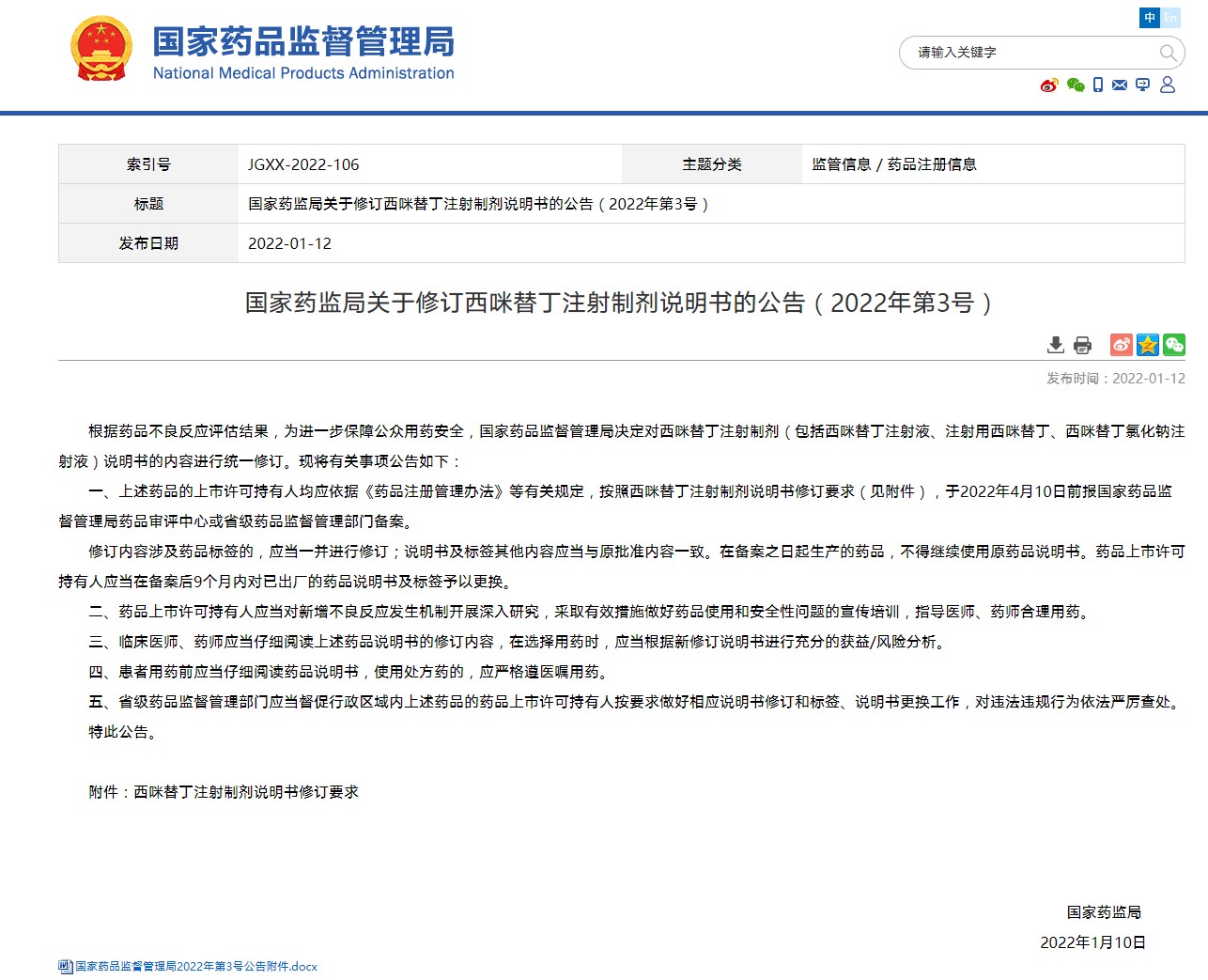 國家藥監(jiān)局關于修訂西咪替丁注射制劑說明書的公告