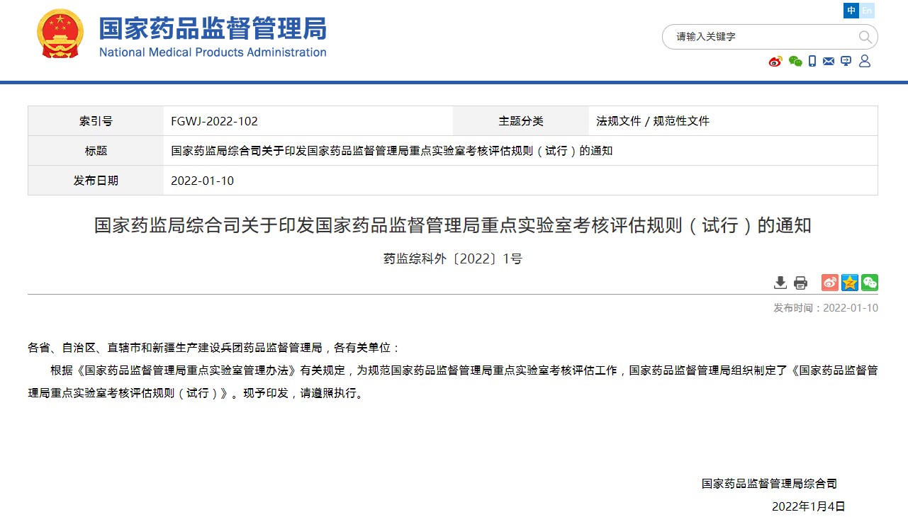 國家藥監(jiān)局綜合司關于印發(fā)國家藥品監(jiān)督管理局重點實驗室考核評估規(guī)則(試行)
