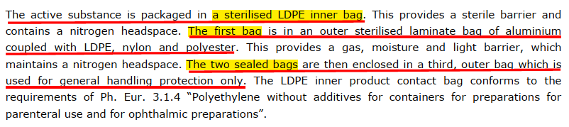 ? 包裝(第一層):活性物質(zhì)裝入滅菌LDPD袋(我們認(rèn)為是聚酯/低密度聚乙烯藥用復(fù)合膜、袋(PET/LDPE)),充氮;提供一個無菌屏障;(未明確是扎口還是封口)。