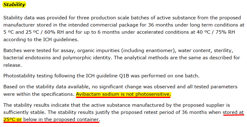 穩(wěn)定性結(jié)果表明,阿維巴坦鈉在商業(yè)化包裝條件下足夠穩(wěn)定。穩(wěn)定性結(jié)果證明,在25°C或以下條件下保存,建議復(fù)試期為36個月。