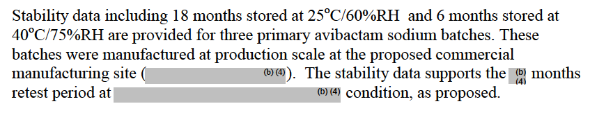 穩(wěn)定性考察結(jié)果:阿維巴坦鈉采用商業(yè)化包裝在25℃/RH60%條件下放置18個月;在40℃/RH75%條件下放置6個月進(jìn)行考察。未能查詢到明確的包裝貯藏條件。