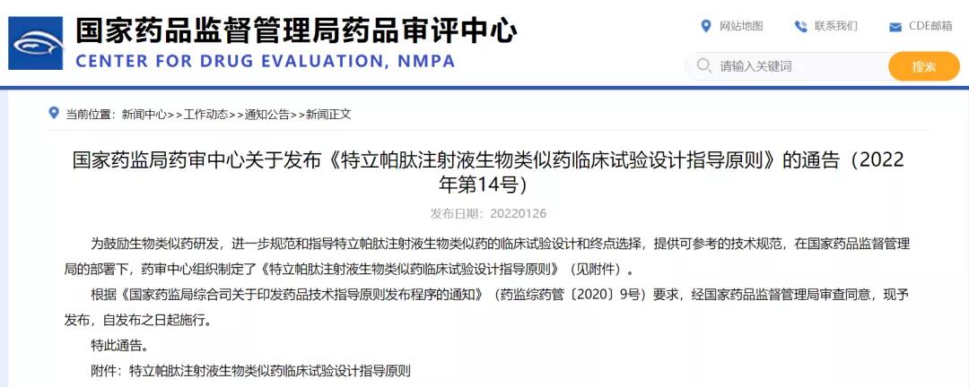 國家藥監局藥審中心關于發布《特立帕肽注射液生物類似藥臨床試驗設計指導原則》的通告(2022年第14號)