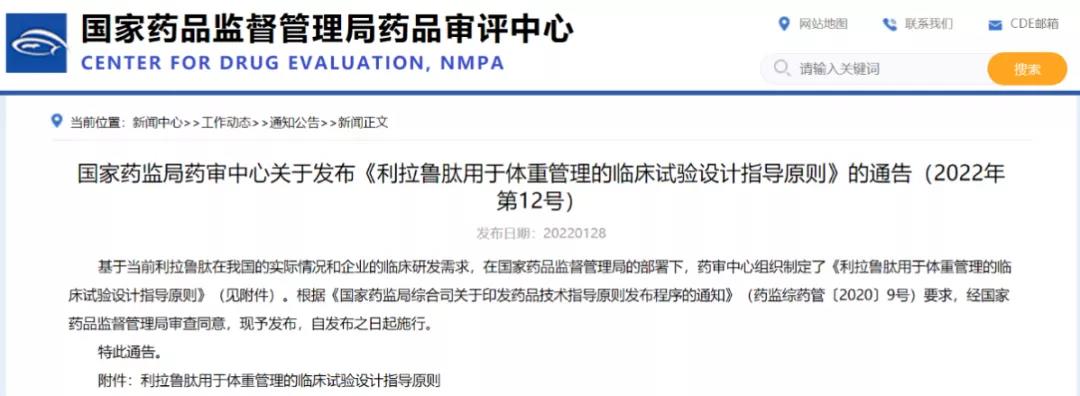 國家藥監局藥審中心關于發布《利拉魯肽用于體重管理的臨床試驗設計指導原則》的通告(2022年第12號)