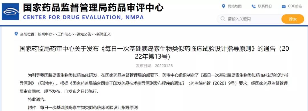 國家藥監局藥審中心關于發布《每日一次基礎胰島素生物類似藥臨床試驗設計指導原則》的通告(2022年第13號)