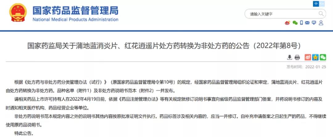 國家藥監局關于蒲地藍消炎片、紅花逍遙片處方藥轉換為非處方藥的公告(2022年第8號)