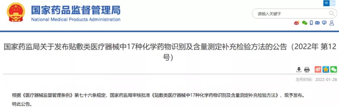國家藥監局關于發布貼敷類醫療器械中17種化學藥物識別及含量測定補充檢驗方法的公告(2022年 第12號)