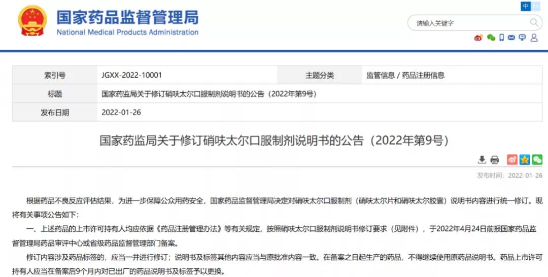國家藥監局關于修訂硝呋太爾口服制劑說明書的公告(2022年第9號)