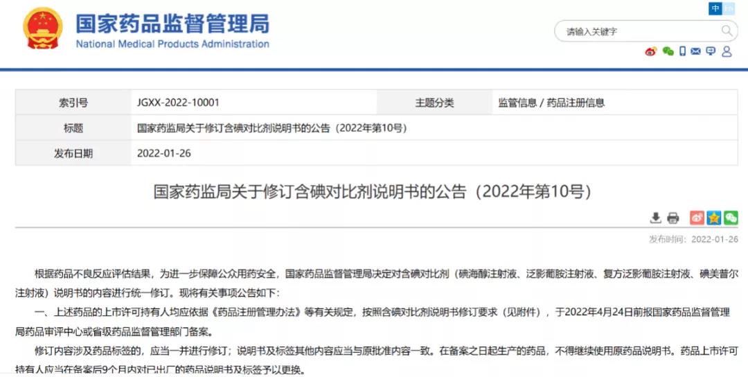 國家藥監局關于修訂含碘對比劑說明書的公告(2022年第10號)