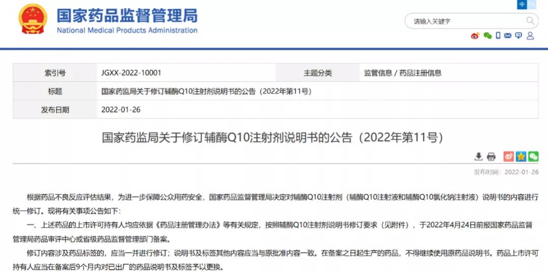 國家藥監局關于修訂輔酶Q10注射劑說明書的公告(2022年第11號)