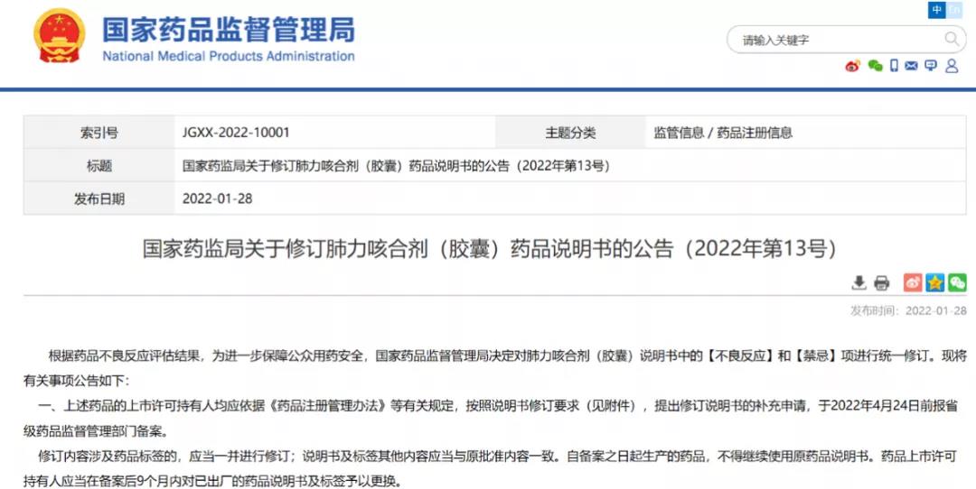 國家藥監局關于修訂肺力咳合劑(膠囊)藥品說明書的公告(2022年第13號)