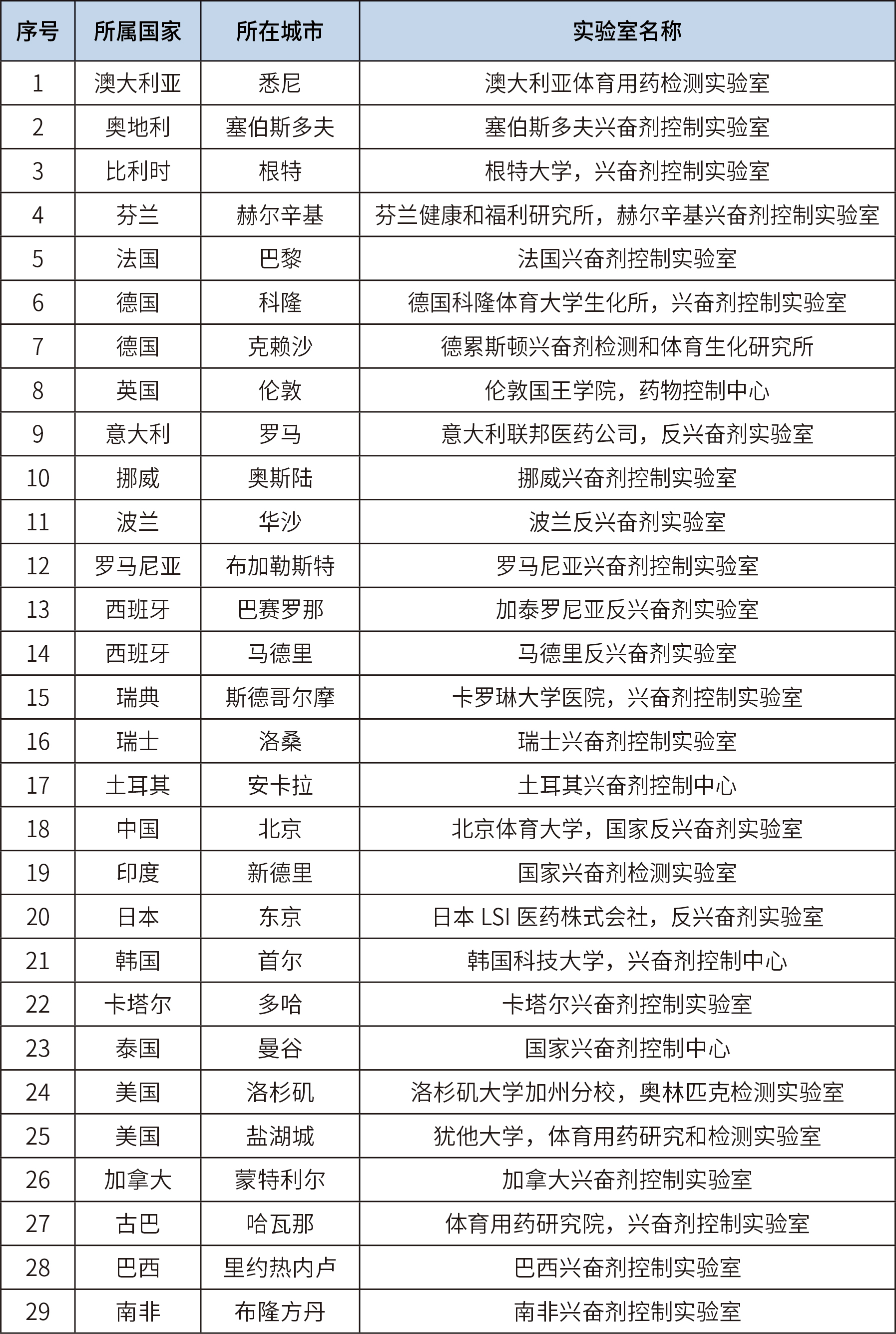 目前全世界共有興奮劑檢測(cè)實(shí)驗(yàn)室29個(gè),分布在五大洲,其中歐洲16個(gè),亞洲6個(gè),北美洲4個(gè),大洋洲、南美洲和非洲各1個(gè),詳見(jiàn)下表: