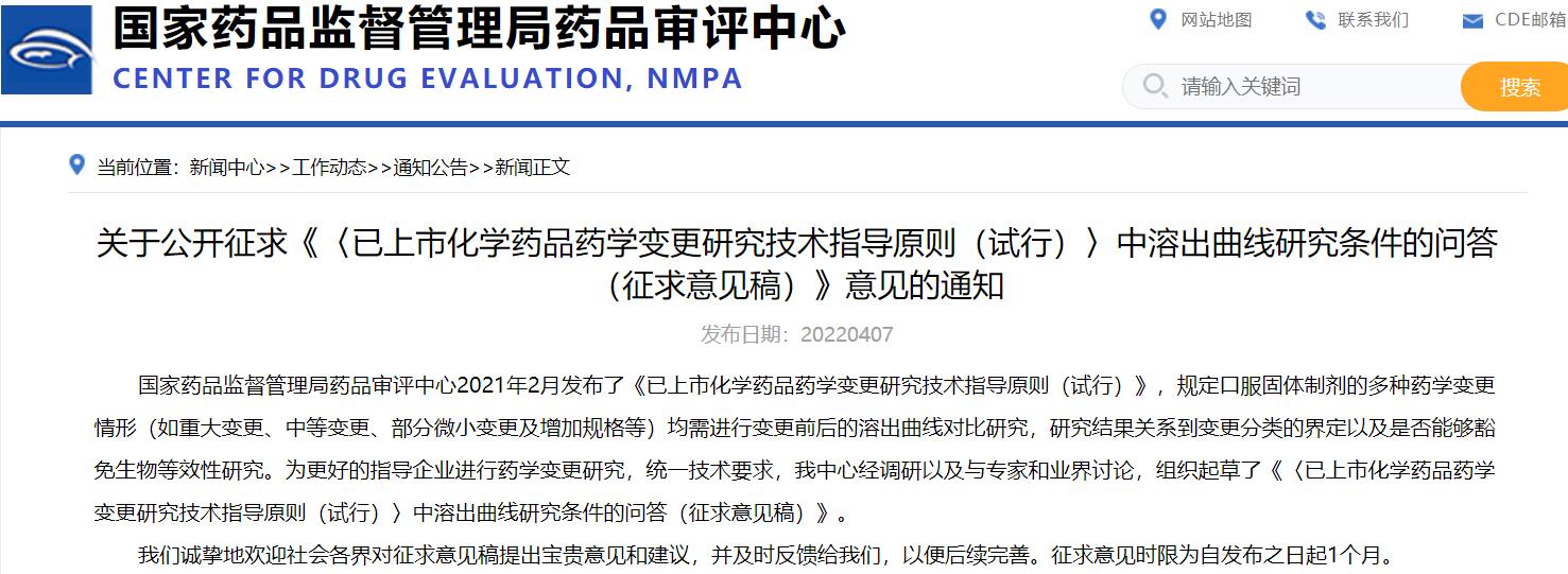 關于公開征求《〈已上市化學藥品藥學變更研究技術指導原則(試行)〉中溶出曲線研究條件的問答(征求意見稿)》意見的通知