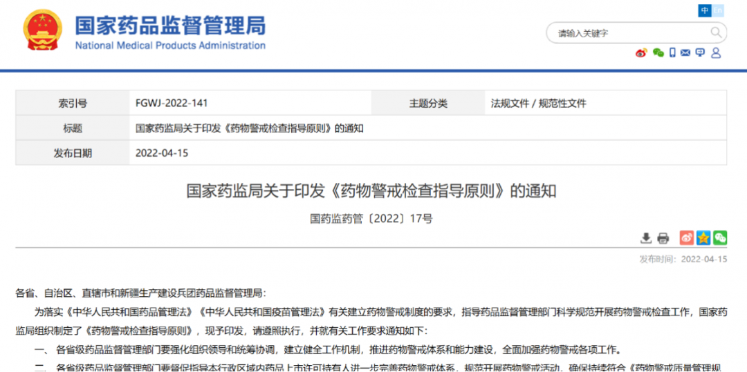 政策法規(guī)||國家藥監(jiān)局發(fā)布《藥物警戒檢查指導(dǎo)原則》(附本周法規(guī)概覽04.11-04.15)