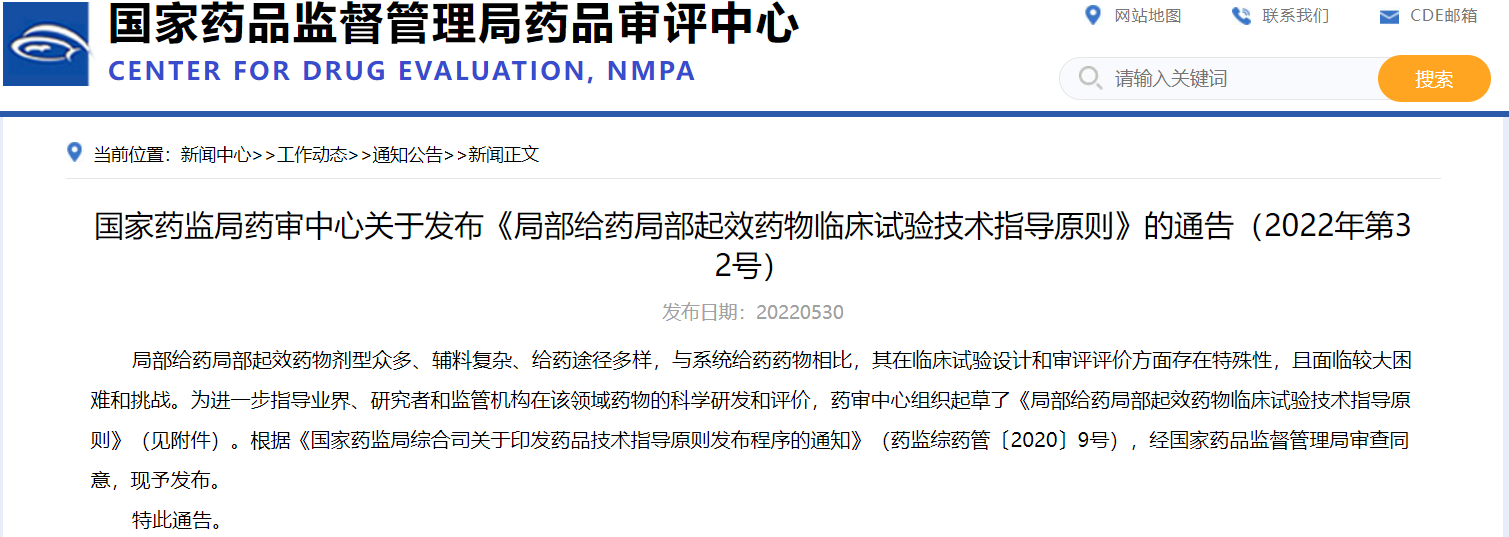 國(guó)家藥監(jiān)局藥審中心關(guān)于發(fā)布《局部給藥局部起效藥物臨床試驗(yàn)技術(shù)指導(dǎo)原則》的通告(2022年第32號(hào))