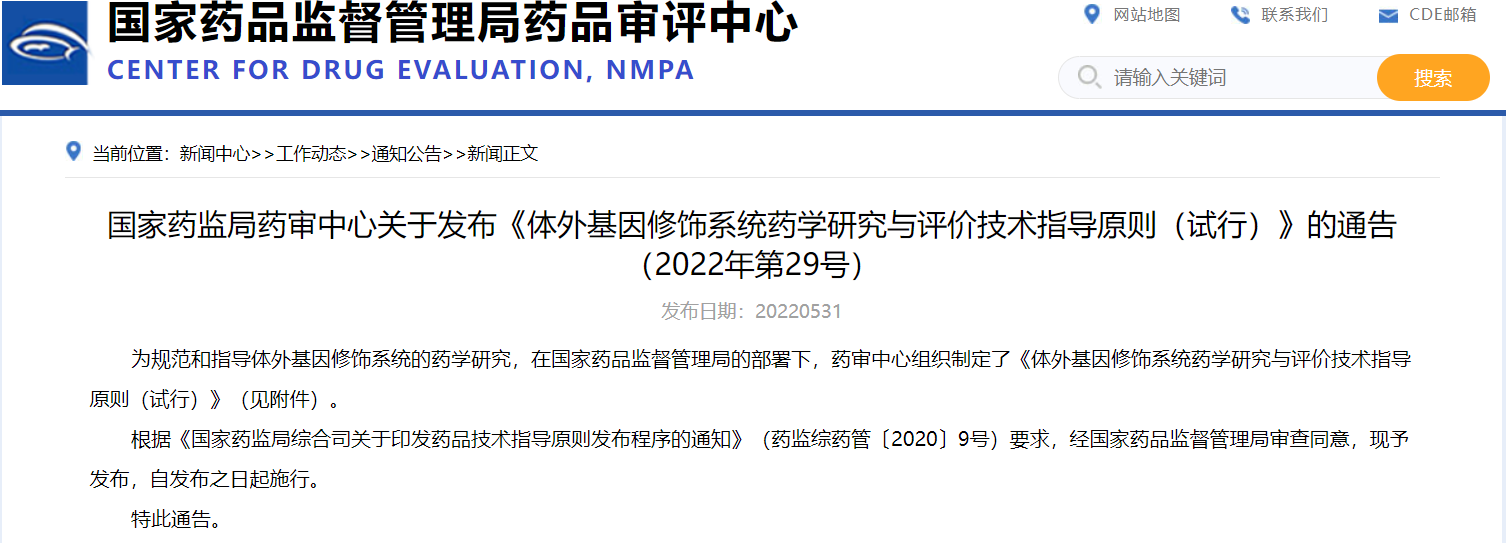 國(guó)家藥監(jiān)局藥審中心關(guān)于發(fā)布《體外基因修飾系統(tǒng)藥學(xué)研究與評(píng)價(jià)技術(shù)指導(dǎo)原則(試行)》的通告(2022年第29號(hào))