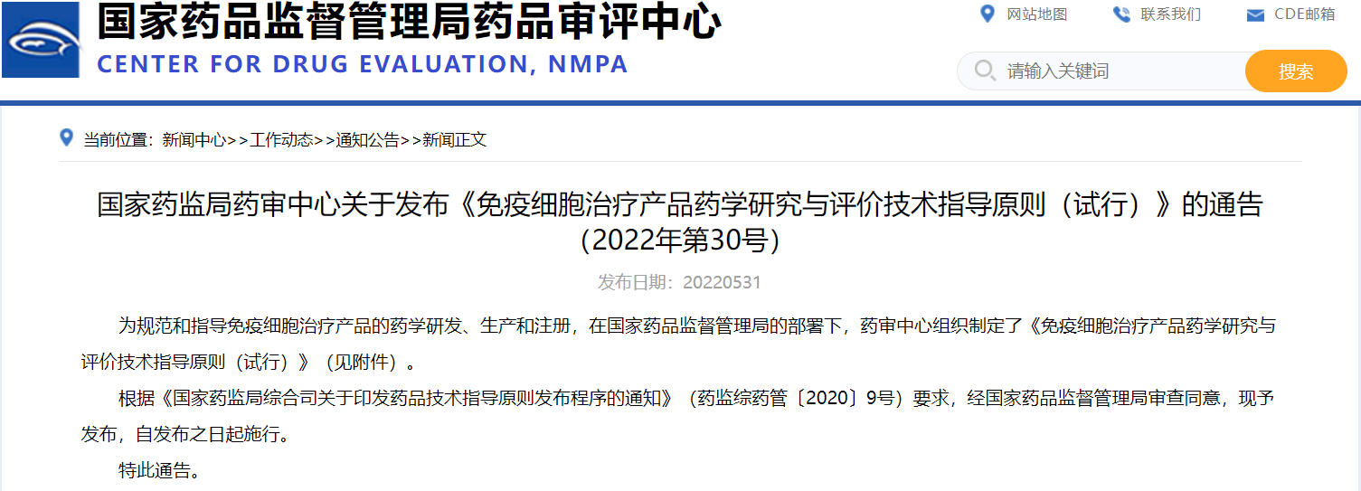 國(guó)家藥監(jiān)局藥審中心關(guān)于發(fā)布《免疫細(xì)胞治療產(chǎn)品藥學(xué)研究與評(píng)價(jià)技術(shù)指導(dǎo)原則(試行)》的通告(2022年第30號(hào))