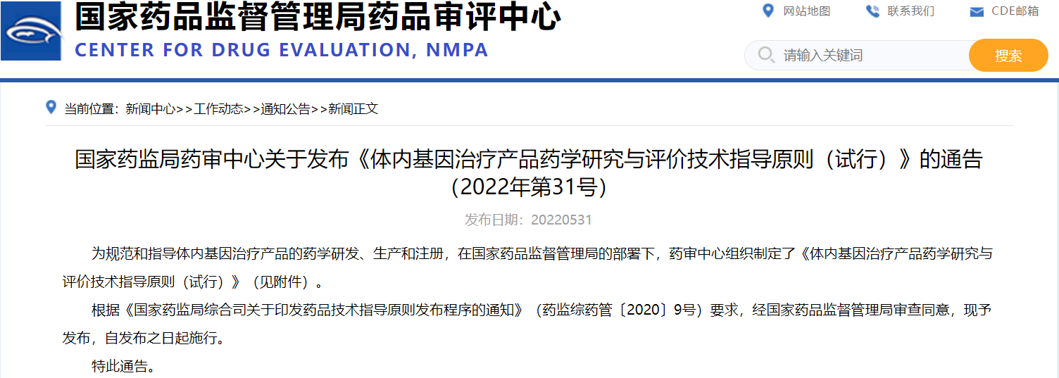 國(guó)家藥監(jiān)局藥審中心關(guān)于發(fā)布《體內(nèi)基因治療產(chǎn)品藥學(xué)研究與評(píng)價(jià)技術(shù)指導(dǎo)原則(試行)》的通告(2022年第31號(hào))