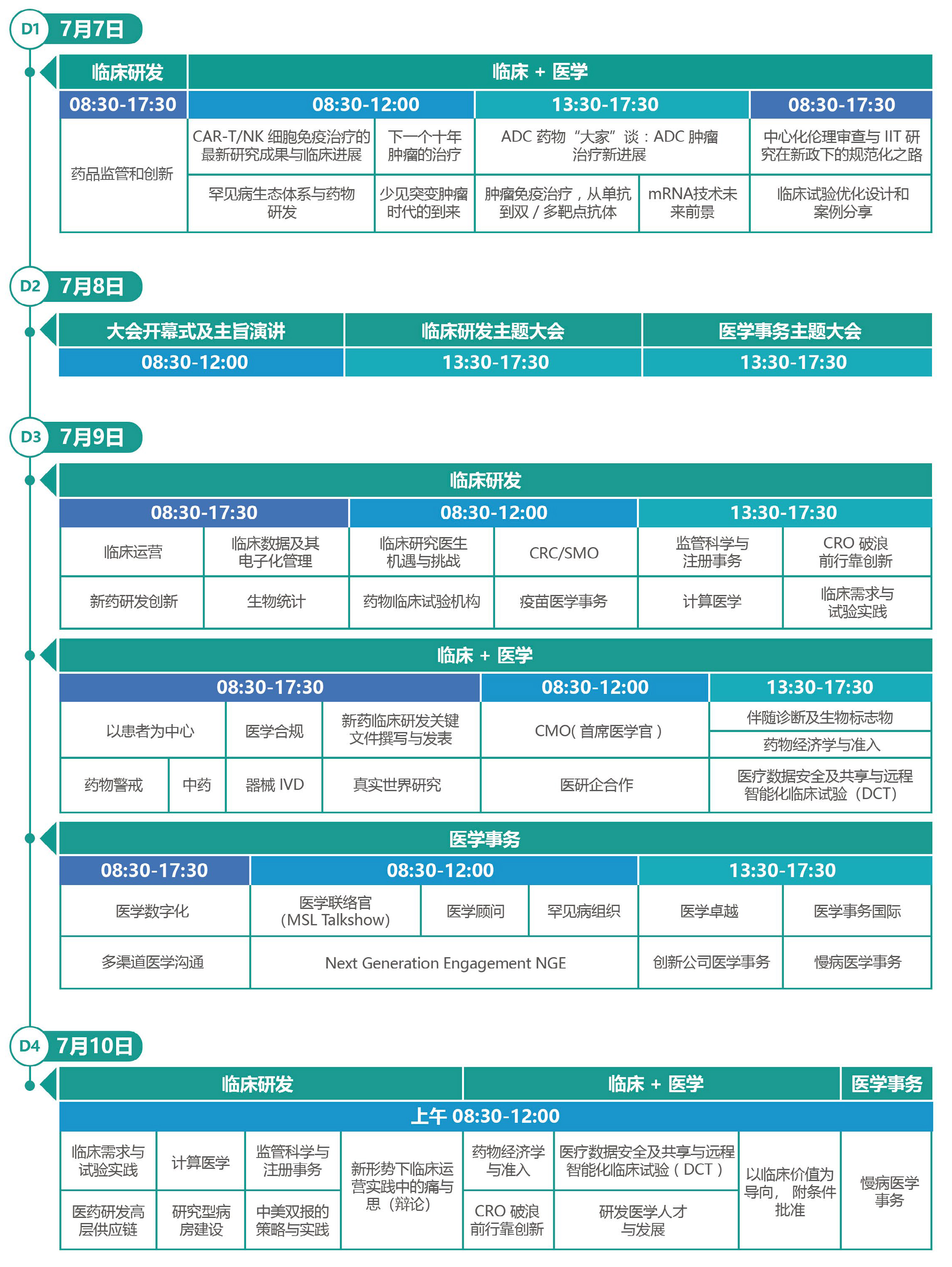 本次會議圍繞藥品監管與創新、治療領域醫學熱點、臨床研發、醫學事務等模塊進行交流分享,同時設有12大專題論壇,演講專家達1000余人,緊跟行業發展趨勢,著力于解決參會同仁痛點及難點問題。