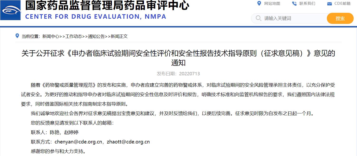 關(guān)于公開征求《申辦者臨床試驗期間安全性評價和安全性報告技術(shù)指導(dǎo)原則(征求意見稿)》意見的通知