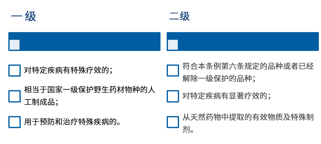 根據《中藥品種保護條例》,國家對受保護的中藥品種劃分一級和二級。中藥一級保護品種分別為三十年、二十年、十年;中藥二級保護品種為七年。