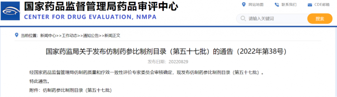 國家藥監局關于發布仿制藥參比制劑目錄(第五十七批)的通告(2022年第38號)
