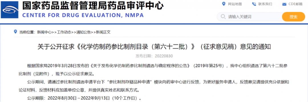 關于公開征求《化學仿制藥參比制劑目錄(第六十二批)》(征求意見稿)意見的通知