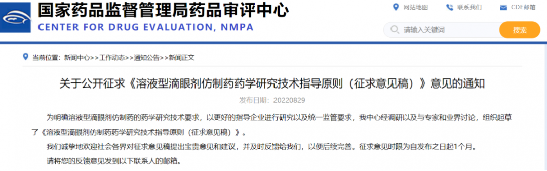 關于公開征求《溶液型滴眼劑仿制藥藥學研究技術指導原則(征求意見稿)》意見的通知