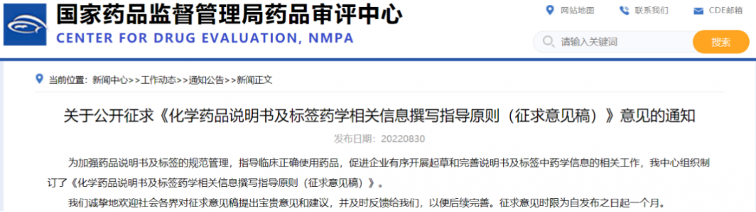 關于公開征求《化學藥品說明書及標簽藥學相關信息撰寫指導原則(征求意見稿)》意見的通知