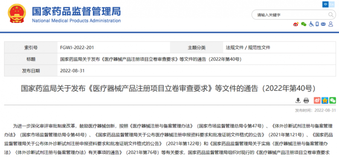 國家藥監局關于發布《醫療器械產品注冊項目立卷審查要求》等文件的通告(2022年第40號)