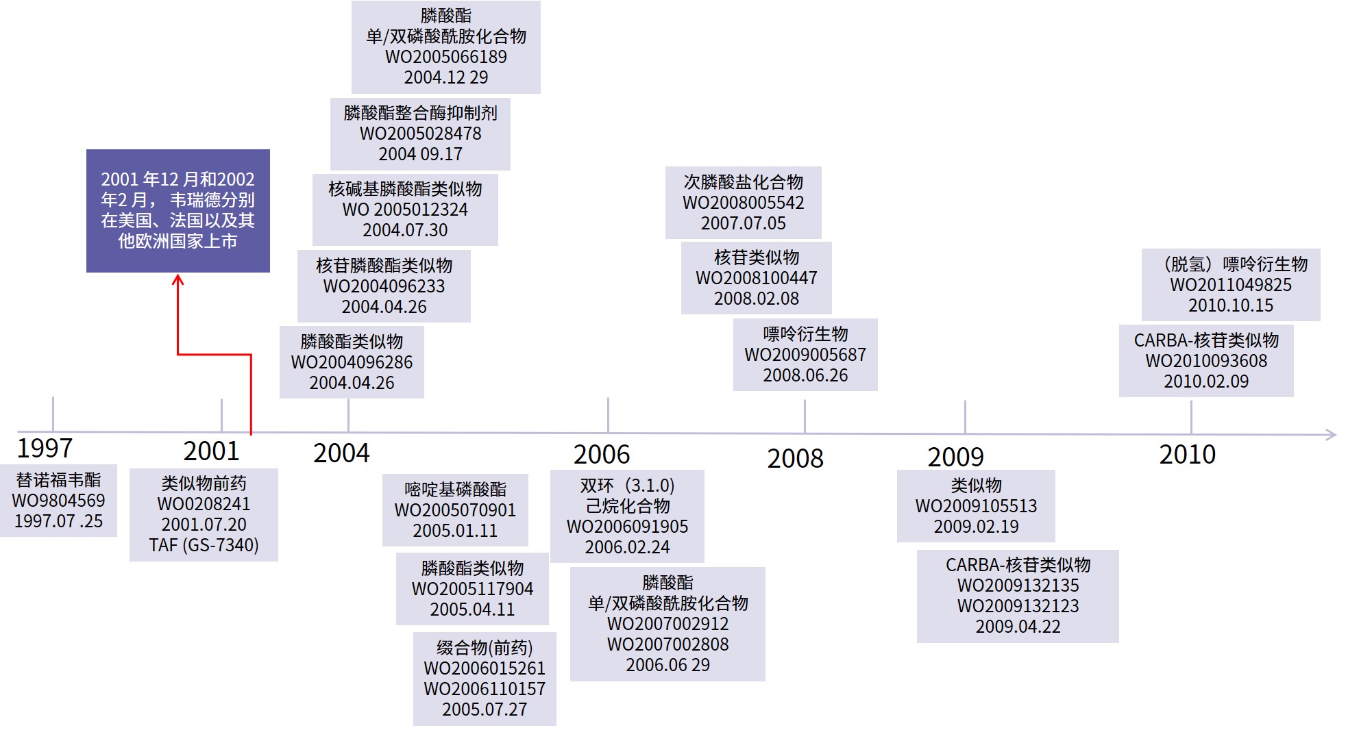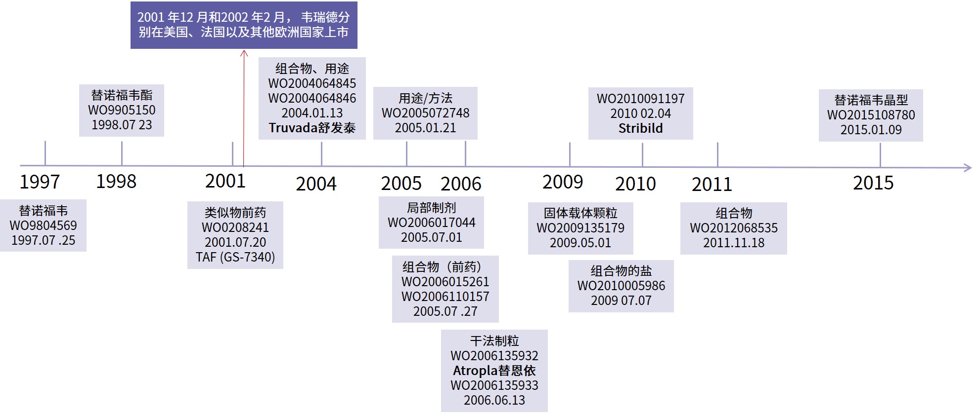 首先,以時間為導(dǎo)向,縱向分析原研公司對替諾福韋酯的專利的布局,見下圖。