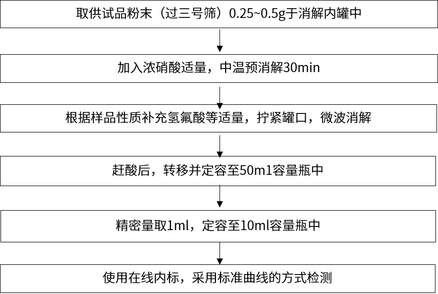 案例二:新領先醫(yī)藥分析測試中心使用電感耦合等離子體質譜儀(ICP-MS)進行了中藥材中的鉛、鎘、砷、汞、銅等元素的的檢測。ICP-MS元素檢測的前處理方法流程如下: