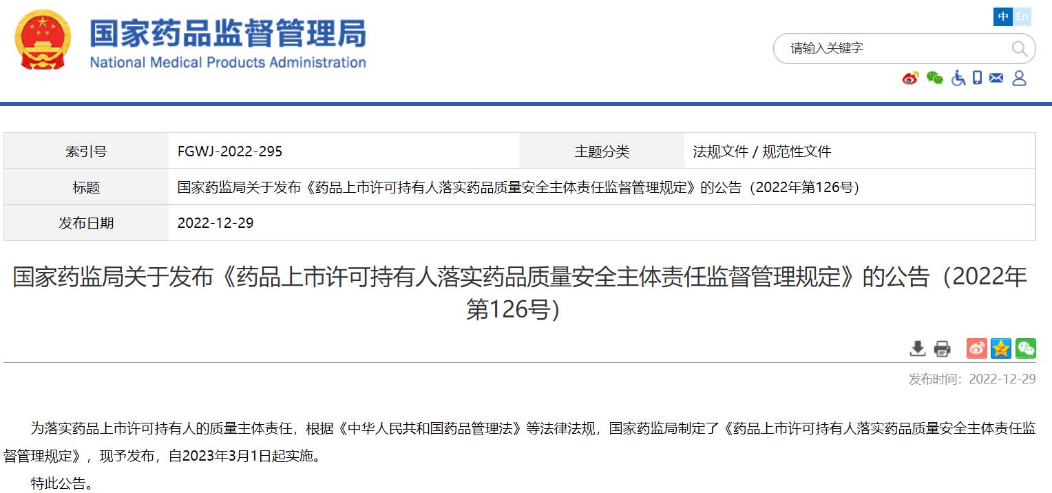 國家藥監局關于發布《藥品上市許可持有人落實藥品質量安全主體責任監督管理規定》的公告(2022年第126號)