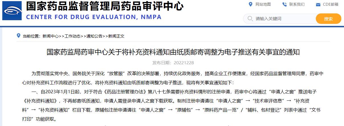 國家藥監局藥審中心關于將補充資料通知由紙質郵寄調整為電子推送有關事宜的通知