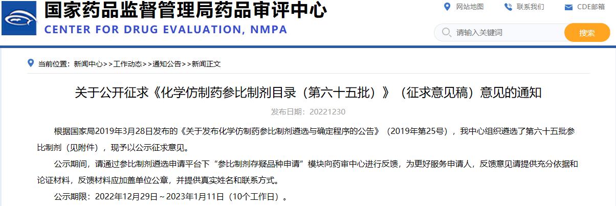 關于公開征求《化學仿制藥參比制劑目錄(第六十五批)》(征求意見稿)意見的通知