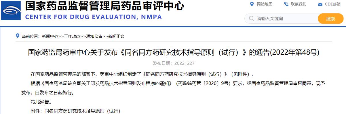 國家藥監局藥審中心關于發布《同名同方藥研究技術指導原則(試行)》的通告(2022年第48號)