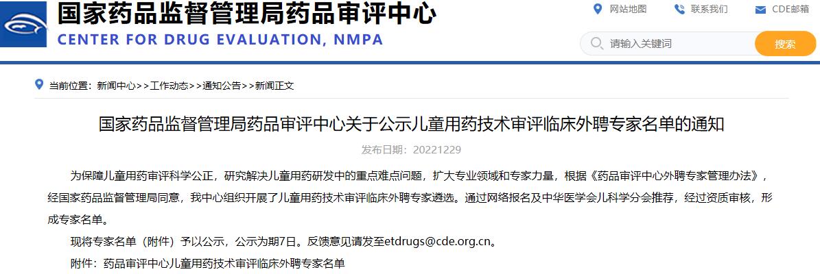 國家藥品監督管理局藥品審評中心關于公示兒童用藥技術審評臨床外聘專家名單的通知