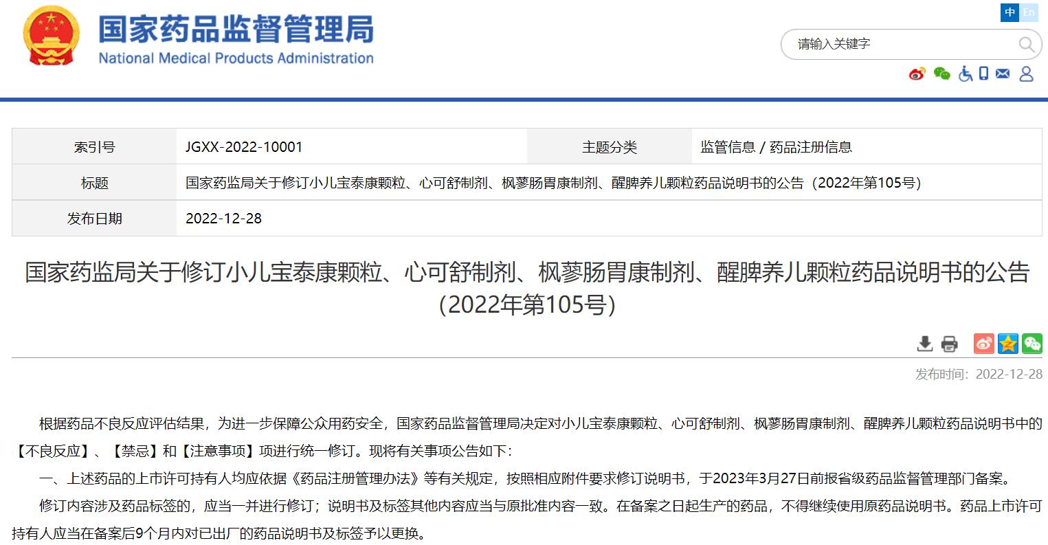 國家藥監局關于修訂小兒寶泰康顆粒、心可舒制劑、楓蓼腸胃康制劑、醒脾養兒顆粒藥品說明書的公告(2022年第105號)