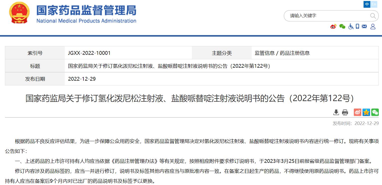 國家藥監局關于修訂氫化潑尼松注射液、鹽酸哌替啶注射液說明書的公告(2022年第122號)