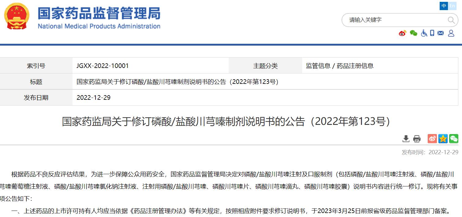 國家藥監局關于修訂磷酸/鹽酸川芎嗪制劑說明書的公告(2022年第123號)