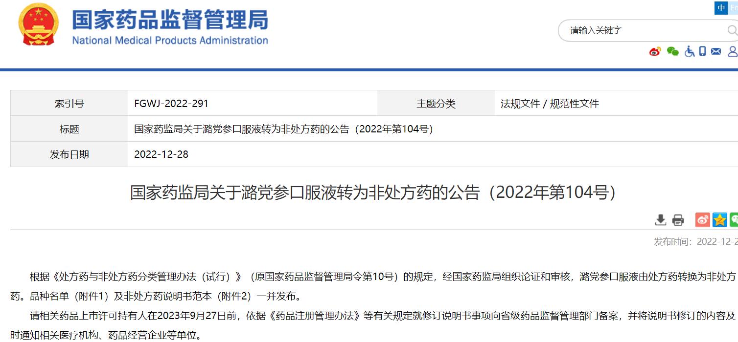 國家藥監局關于潞黨參口服液轉為非處方藥的公告(2022年第104號)