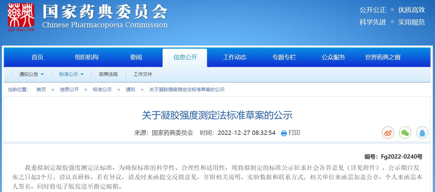 國家藥典委發布凝膠強度測定法標準草案的公示。