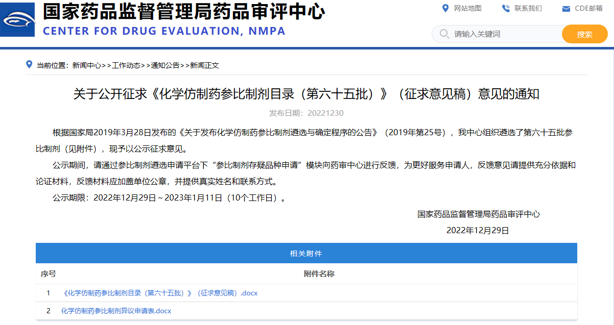 關于公開征求《化學仿制藥參比制劑目錄(第六十五批)》(征求意見稿)意見的通知