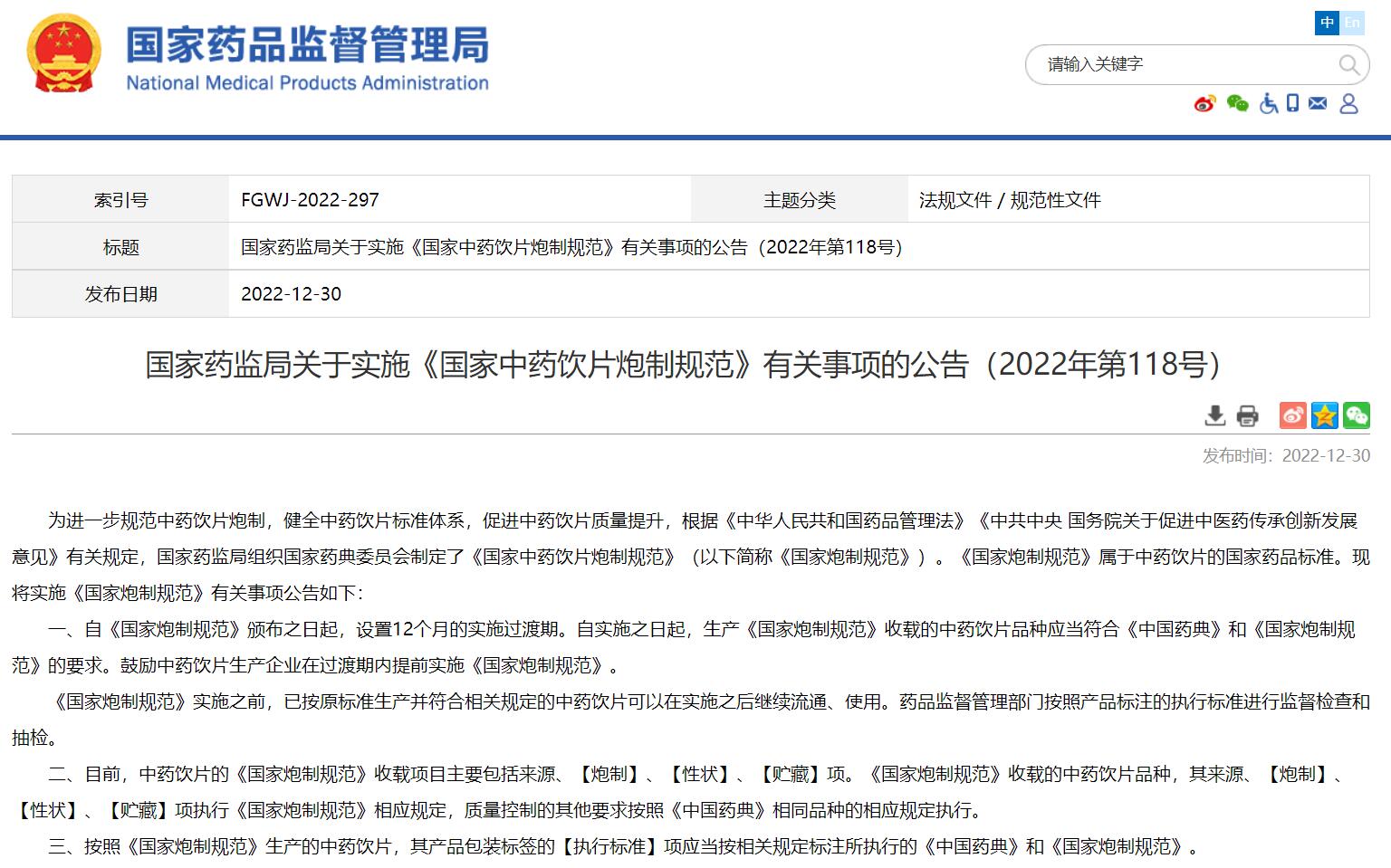 國家藥監局關于實施《國家中藥飲片炮制規范》有關事項的公告(2022年第118號)