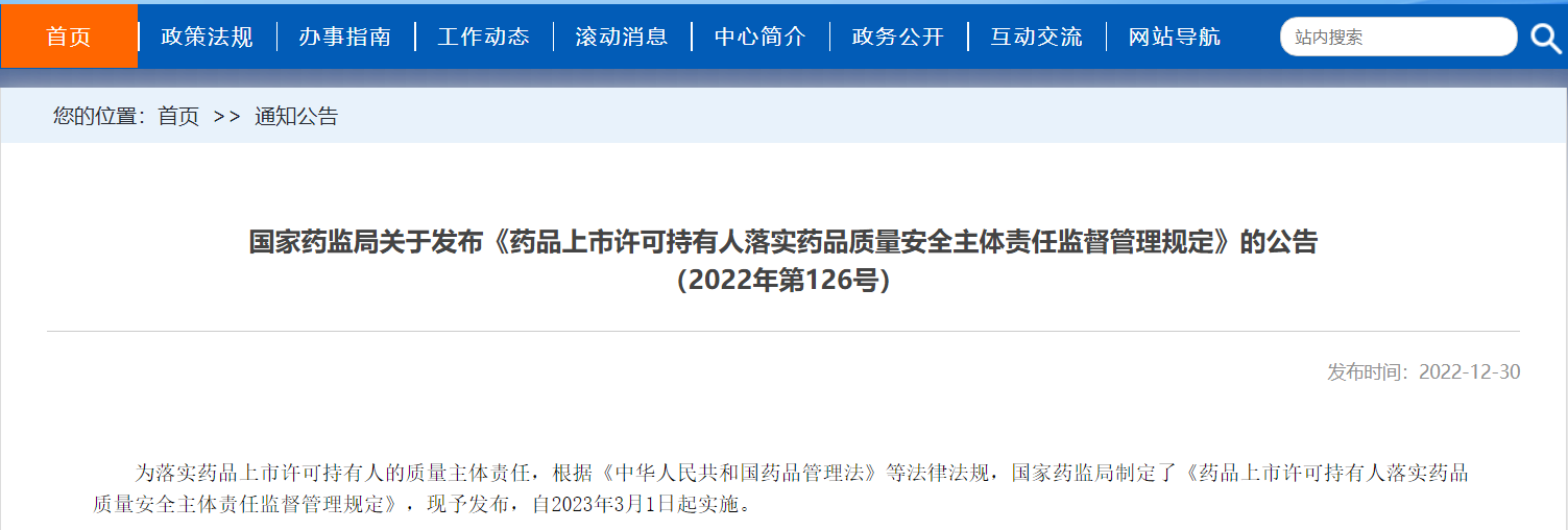 國家藥監局關于發布《藥品上市許可持有人落實藥品質量安全主體責任監督管理規定》的公告(2022年第126號)