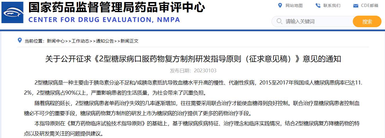關于公開征求《2型糖尿病口服藥物復方制劑研發指導原則(征求意見稿)》意見的通知