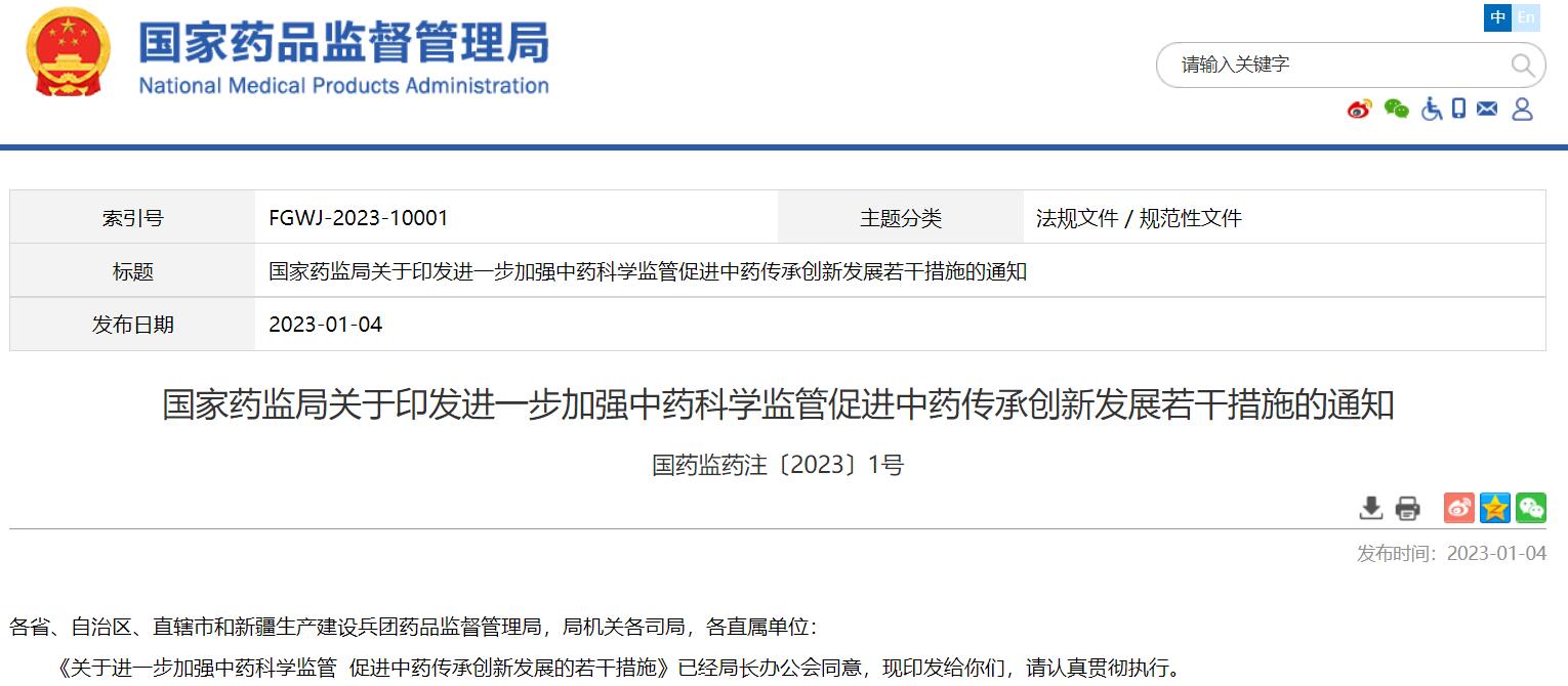 國家藥監局關于印發進一步加強中藥科學監管促進中藥傳承創新發展若干措施的通知