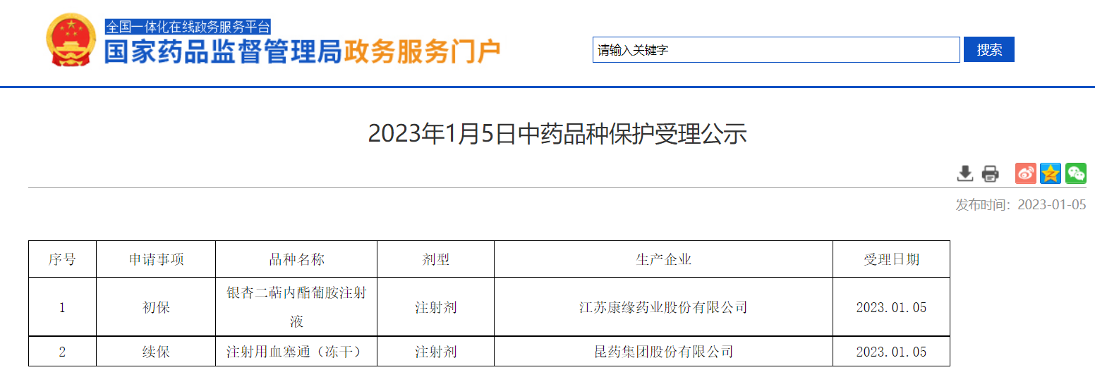 2023年1月5日中藥品種保護受理公示