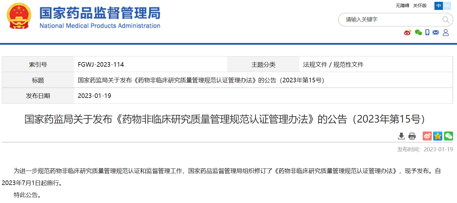 國家藥監局關于發布《藥物非臨床研究質量管理規范認證管理辦法》的公告(2023年第15號)