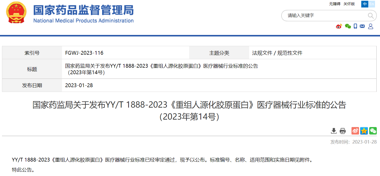 國家藥監局關于發布YY/T 1888-2023《重組人源化膠原蛋白》醫療器械行業標準的公告 (2023年第14號)