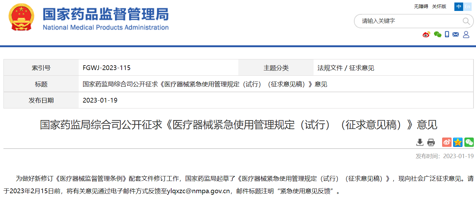 國家藥監局綜合司公開征求《醫療器械緊急使用管理規定(試行)(征求意見稿)》意見